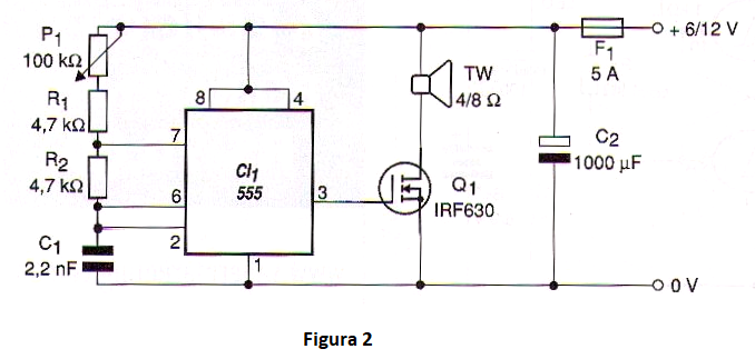 El circuito es bastante simple consistente en un oscilador basado en el conocido circuito integrado 555. El capacitor conectado a los pines 2 y 6 determina la frecuencia central de la banda de oscilaciones. La frecuencia exacta se puede ajustar en P1. La señal de este oscilador se aplica a un transistor de potencia que excita un tweeter piezoeléctrico.