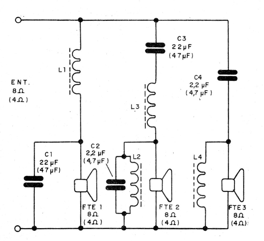 Los capacitores deben ser despolarizados y sus valores dependen de la impedancia. Los valores entre paréntesis son para sistemas de 4 ohms.