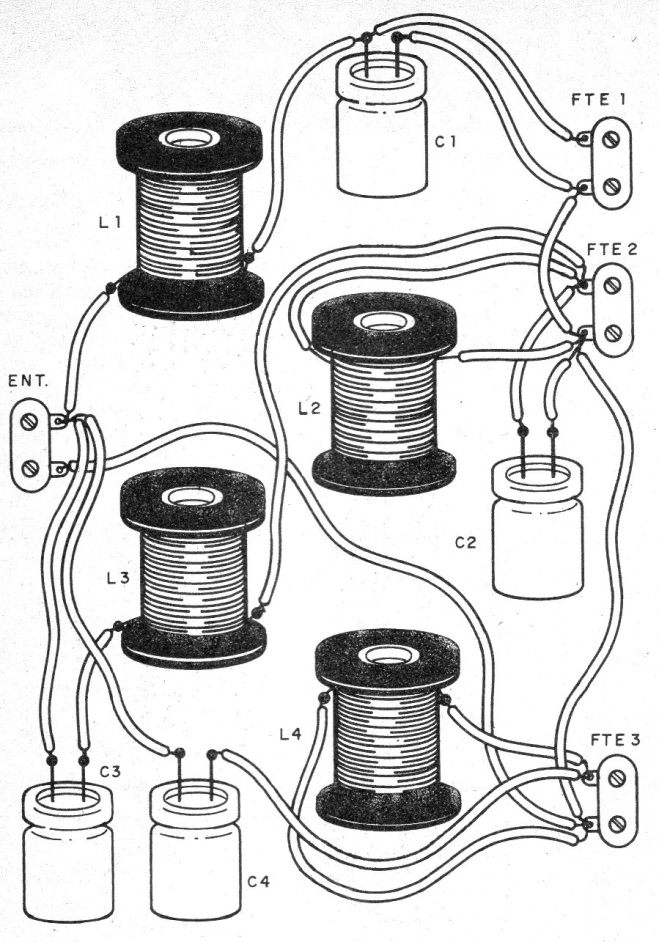 Todas las bobinas se enrollan con fo 18 o 20 en un carrete con núcleo de ferrita. L1 tiene 500 espiras, L2 tiene 140 espiras, L3 150 espiras, L4 tiene 100 espiras para el caso de carga de 4 ohms. Para 8 ohms, L1 tiene 280 espiras, L2 tiene 250 espiras, L3 tiene 100 espiras y L4 60 espiras.