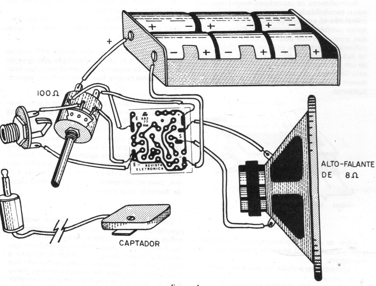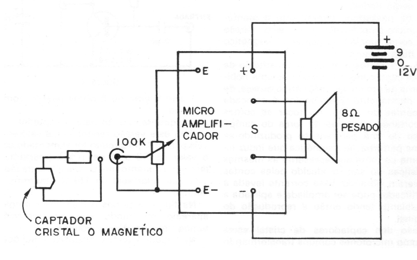 Normalmente los captadores magnéticos poseen sensibilidad menor que los captadores de cristal no sólo en vista de su menor impedancia, sino también por la construcción física, en cuyo caso, para obtener potencia total del micro-amplificador tendremos que usar un preamplificador a su entrada. En la figura 2 tenemos el diagrama de un preamplificador que se puede utilizar para este propósito. Sus conexiones, como siempre deben ser cortas para evitar la captación de zumbidos.