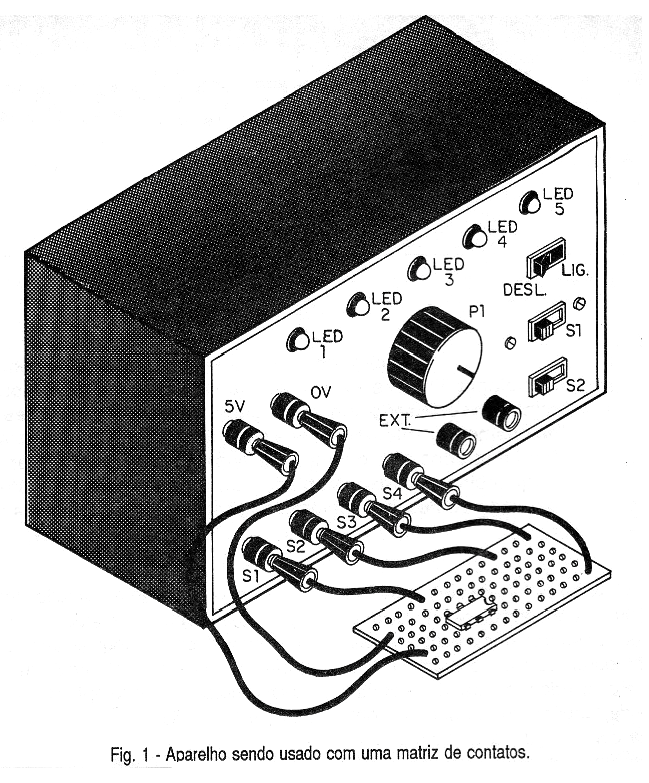 En los puntos J1 y J2 tenemos la disponibilidad de 5V para alimentación de circuitos TTL externos, por ejemplo en el desarrollo de un proyecto en una matriz de contactos. En la figura 1 damos una sugerencia de cómo el aparato podría ser utilizado en un banco.
