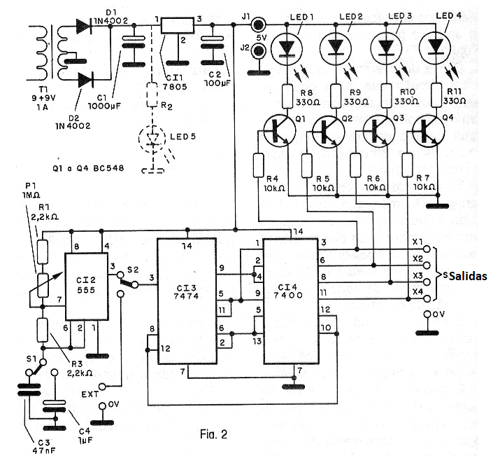 La señal secuencial, en la que cada ciclo de reloj una de las salidas va al nivel alto está disponible en los puntos de X1 a X4. Ver que tenemos en estos puntos una señal cuyo nivel bajo corresponde a 0 V y el nivel alto a 5V. La corriente máxima disponible, del orden de 10 mA, ocurre en el nivel bajo.