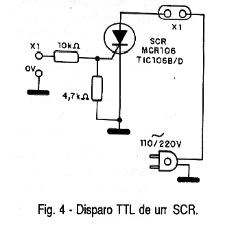 Para accionar circuitos externos de mayor potencia, que no sean entradas TTL tenemos diversas opciones. En la figura 4 tenemos el caso de disparo de SCRs para un sistema secuencial de lámparas de hasta 40 0W en la red de 110V.