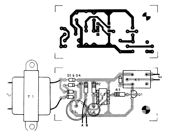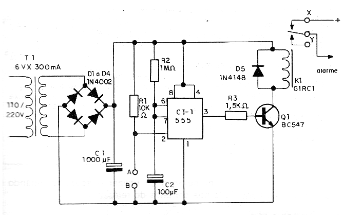 La alimentación viene de una fuente con transformador, 4 diodos y un capacitor de filtro. El sensor de disparo se conecta entre los puntos A y B.