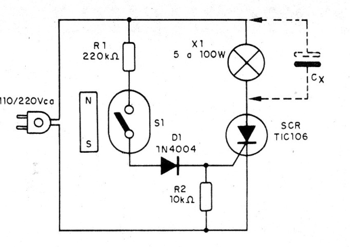 Para un sistema de alarma utilice como carga una cigarra de 110 V o 220 V, según la red local. Para obtener mayor potencia de una bombilla incandescente, conecte un capacitor de 2,2 a 10 uF x 300 V en paralelo.