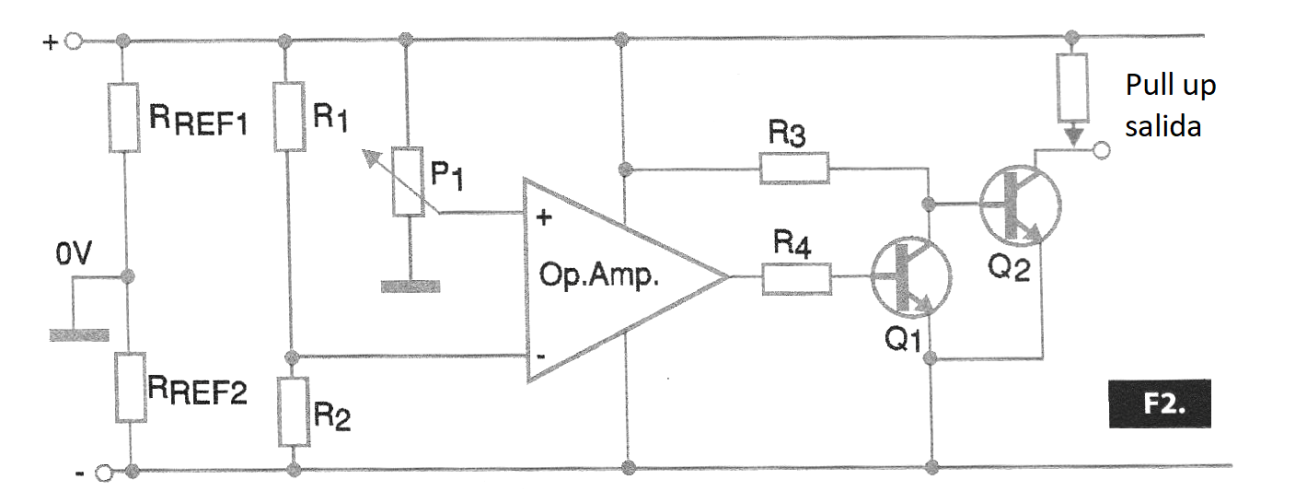 En la figura 1 tenemos la configuración básica de un comparador típico en el que además de un amplificador operacional tenemos una salida de potencia con un transistor en colector abierto.