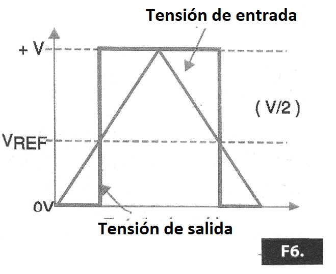 A partir de una tensión nula de entrada, aplicada a la entrada no inversora, tenemos una tensión nula en la salida. Cuando esta tensión alcanza el valor de referencia, fijado por el divisor R1 / R2, la tensión de salida conmuta y va al máximo (+ V). Esta tensión permanece alta hasta que, después de alcanzar el máximo, la tensión de entrada cae, y nuevamente alcanza el valor de referencia. En ese punto, el comparador conmuta y su salida va a cero, como muestra la figura 6.