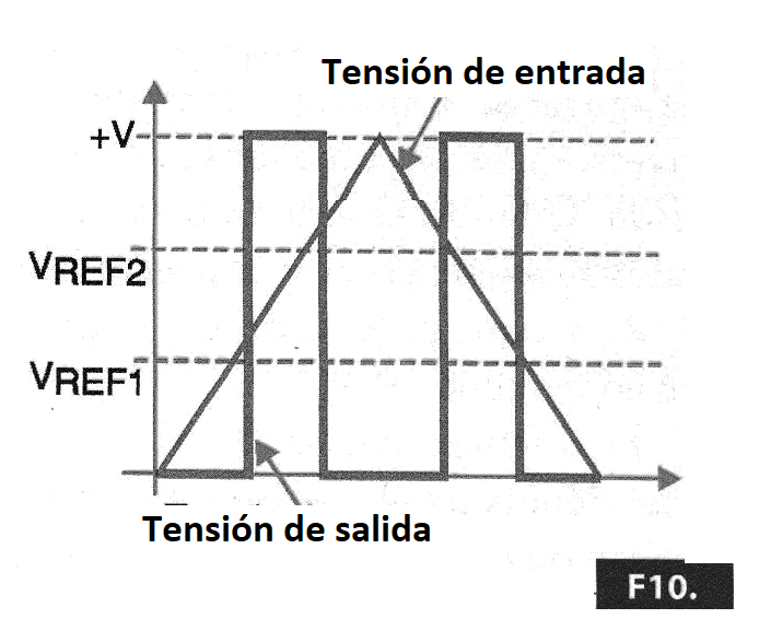 Este comparador proporciona una salida cuando la tensión de entrada se sitúa entre dos valores de referencia, programados por una red divisora. En la figura 10 tenemos un gráfico que muestra el comportamiento de ese circuito, en el que la tensión de salida de los dos comparadores estará en el nivel alto cuando la tensión de entrada esté entre los valores de referencia.