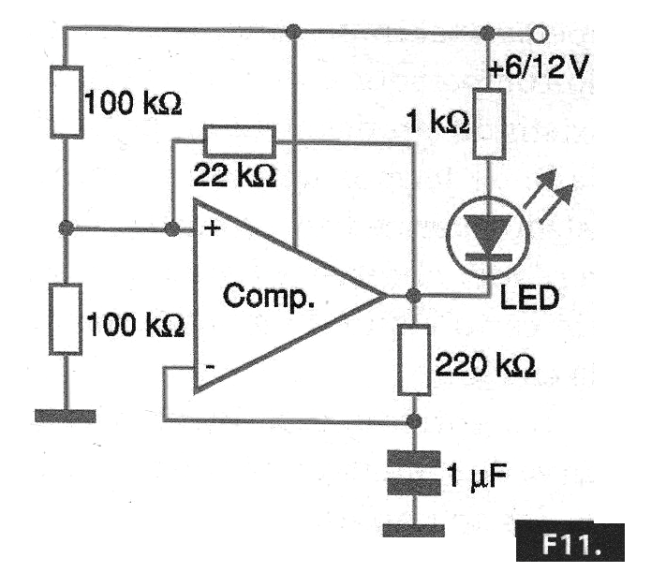 Otra aplicación para los comparadores de tensión es como oscilador, proporcionando una señal rectangular de buena estabilidad. En la figura 11 tenemos un circuito de frecuencia muy baja que excita un LED.
