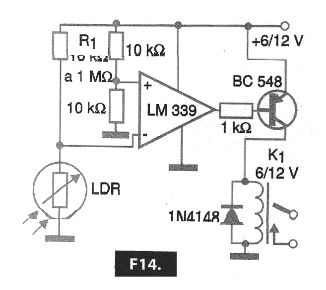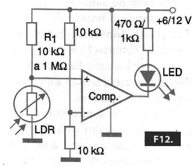 El primer circuito es de un sensor foto-eléctrico usando un LDR como elemento sensible. La sensibilidad de este circuito depende de R1 que puede tener valores entre 10 k y 1 M. La configuración que activa un LED en la salida se muestra en la figura 12 y puede ser alimentada con tensiones de 5 a 12 V.