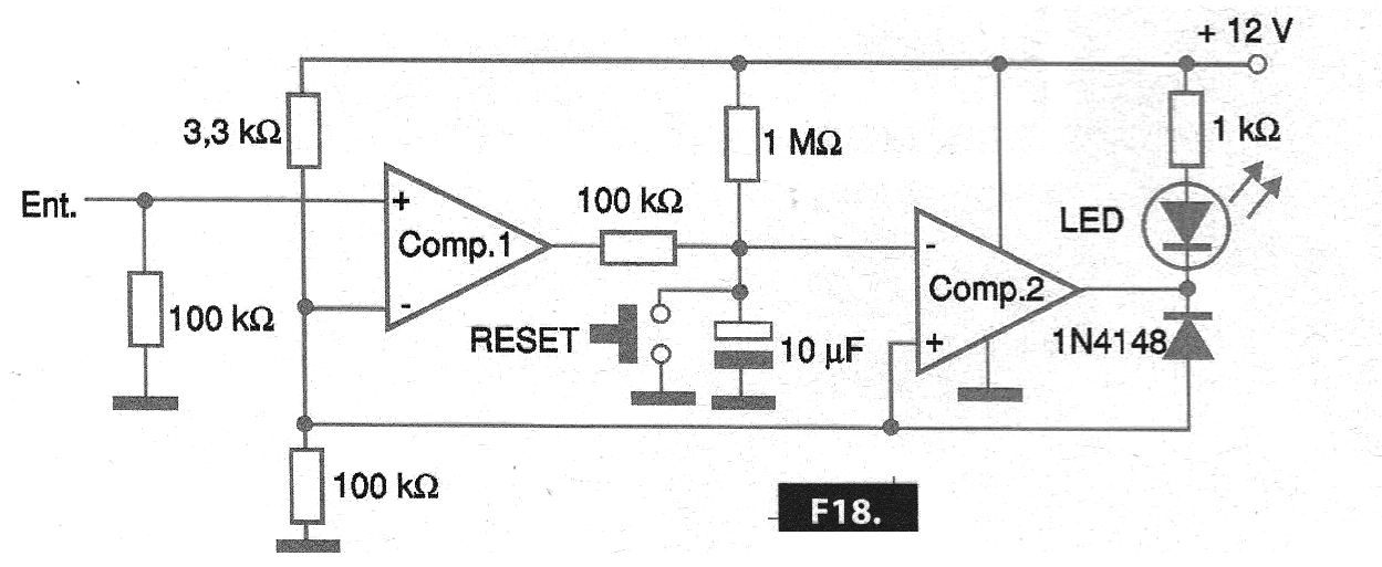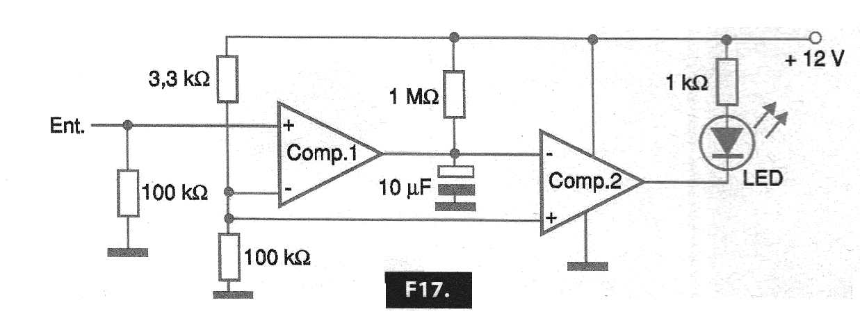 En la figura 17 tenemos una amplificación interesante en la que dos comparadores se utilizan para accionar una carga con retardo.