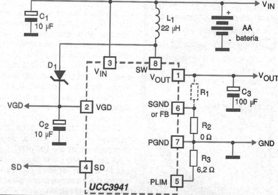 Como hemos visto en el ítem anterior, el chip de control UCC3941 puede ser encontrado en versiones con tensión de salida de 3,3 V, 5 V y ajustable. Para las versiones de tensión fija el resistor R1 no está incluido y el resistor R2 consiste en un puente (0 ohmios) entre el pin 6 y la tierra del circuito.