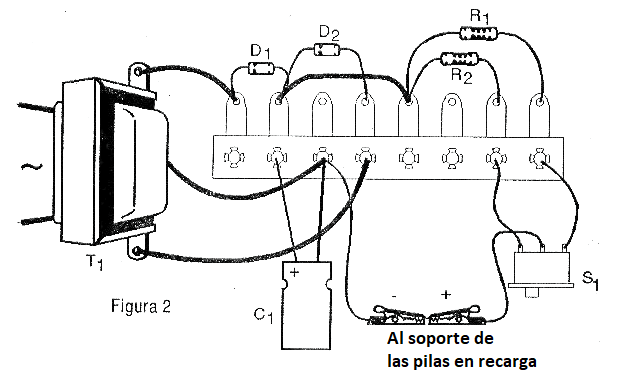 Los diodos son del tipo 1N4002 o equivalentes y el capacitor electrolítico debe tener una tensión de trabajo de 16 V o más. Los resistores R1 y R2 que determinan la intensidad de la corriente de reactivación conforme las pilas son de 1 vatio o mayores. La llave S1 hace la conmutación del resistor, determinando así la intensidad de la corriente de reactivación de las pilas según su tipo.