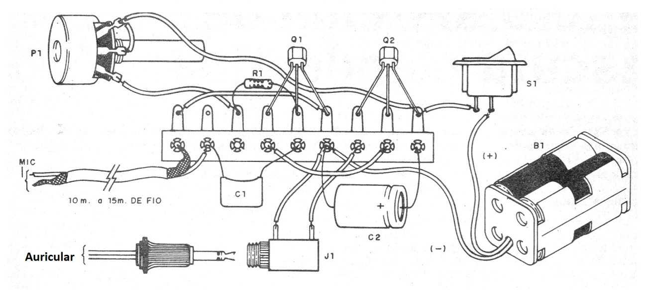 En el montaje, observe las posiciones de los transistores y aunque sean de tipos diferentes. El auricular es de baja impedancia y el micrófono puede ser tanto del tipo dinámico como piezoeléctrico.