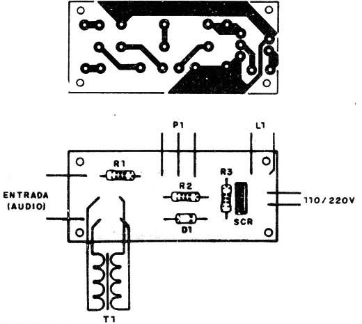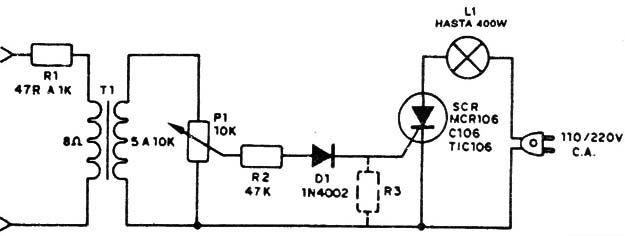 El circuito presentado hace guiñar lámparas de 5 a 100 W con el ritmo de la música de un aparato de sonido. Los alambres de entrada son conectados directamente al altoparlante del aparato de audio. Vea que este circuito no roba ninguna potencia al amplificador, pues la energía que enciende las lámparas proviene de la red domiciliaria. El amplificador entrega apenas unos milésimos de watt para controlar el SCR.
