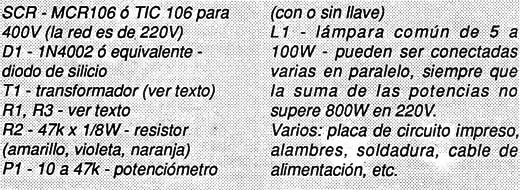 El resistor R3 será necesario y tendrá valores entre 4k7 y 10k, cuando se use el TlC106 en lugar del MCR106. Este SCR debe ser montado en un pequeño disipador de calor.