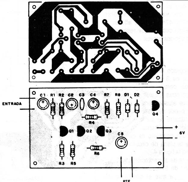 La alimentación se hace con solamente 6V y la carga puede ser un parlante de 8 ohm, por lo menos de 3" para mejor calidad de sonido. En la figura 1 tenemos el diagrama del amplificador y en la figura 2 tenemos la microplaca que posibilita la utilización del circuito con facilidad incluso en espacios reducidos.