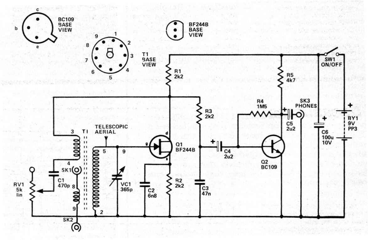 Encontramos este circuito en una documentación de 1974. El transistor bipolar puede ser el BC548 y en la salida podemos conectar un auricular y un amplificador. La bobina tiene varios devanados, el principal es de 10 a 30 vueltas de hilo 28 en una barra de ferrita y las otras tienen menos vueltas. El circuito está alimentado por una batería de 9V.