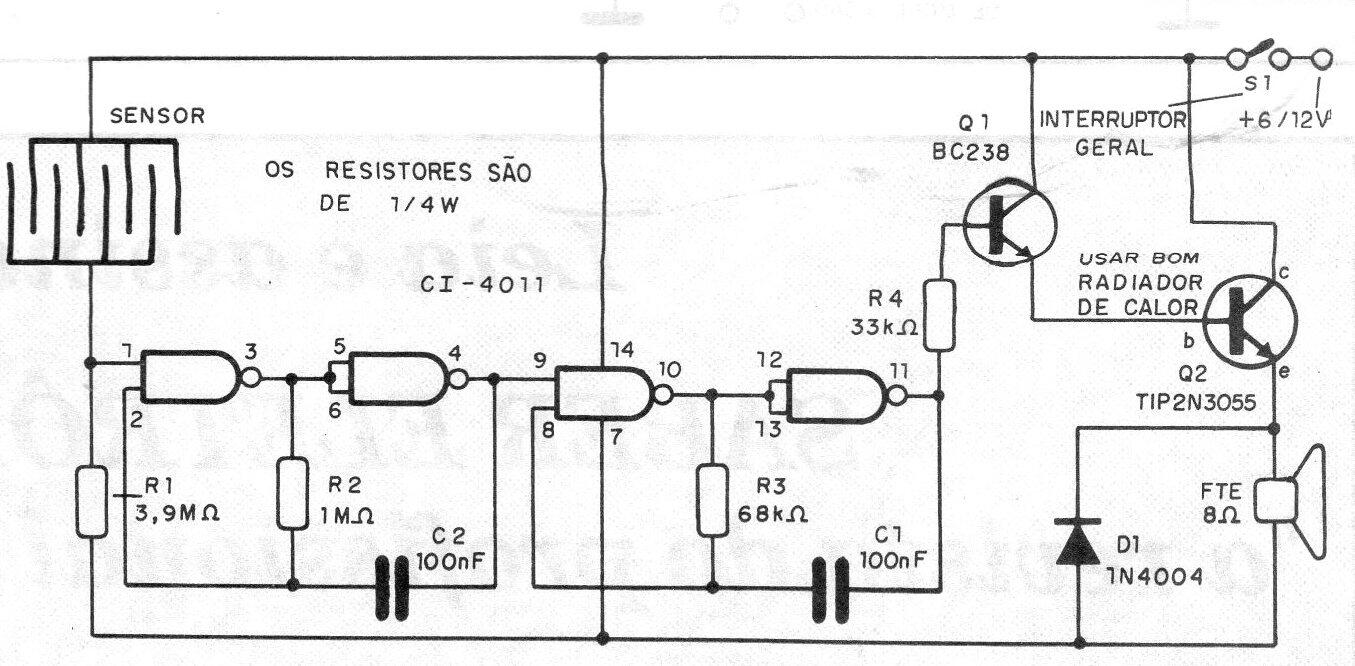 Esta alarma de humedad, lluvia o fugas se encontró en una publicación de 1992. El sensor consiste en una placa de circuito impreso con el patrón indicado. La alimentación puede realizarse con baterías o en el estado de espera, el consumo del dispositivo es muy bajo. Si utiliza una fuente de alimentación, debe tener un transformador. El modo del accionamiento está determinado por los capacitores (tono y parpadeo).