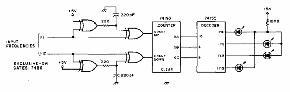 Este circuito TTL para señales digitales de hasta unas pocas docenas de megahercios se encontró en la documentación antigua, pero hoy en día puede ensamblarse fácilmente e incluso usarse como un escudo para microcontroladores. La alimentación se debe suministrar con una tensión de 5 V.