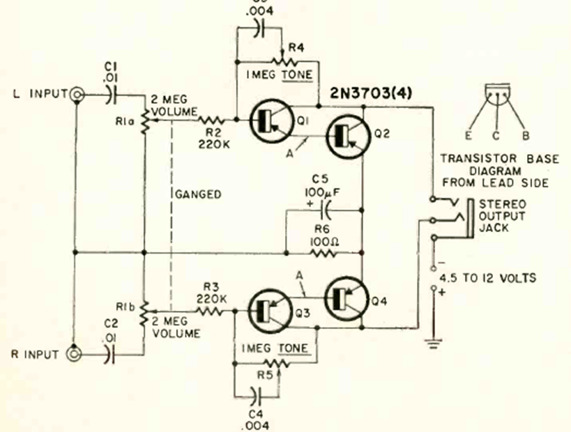 Encontramos este circuito en la revista Radio Electronics de diciembre de 1968. El circuito se utiliza con auriculares magnéticos de alta impedancia. Los transistores son de la época.