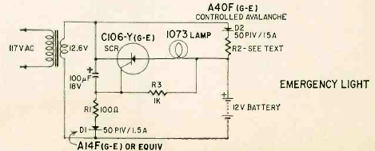 Este circuito que activa una lámpara cuando hay un corte de suministro eléctrico, alimentándola desde una batería, fue publicado en Radio Electronics en noviembre de 1967. En lugar de la lámpara se pueden utilizar LED con la alimentación adecuada y una batería, dependiendo de la carga suministrada.