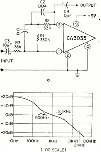 Utilizando un circuito integrado RCA CA3035, este circuito de tocadiscos se encontró en la revista Radio Electronics de febrero de 1970. La curva de respuesta se muestra al lado del diagrama.