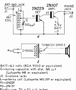 Este circuito para la banda AM con dos transistores fue encontrado en la revista Radio Electronics de junio de 1960. Debe usar una buena antena y funciona con baterías.