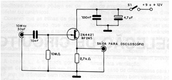 Muchos osciloscopios tienen entradas de alta impedancia que dificultan la observación de señales de alta frecuencia en determinados casos. Con el circuito indicado podemos observar señales de frecuencias hasta 10 MHz, sin el problema de adaptación de impedancias que puede afectar al circuito. El FET de unión admite equivalentes y, como el consumo del dispositivo es bajo, se puede utilizar una batería común de 9 V para alimentarlo.