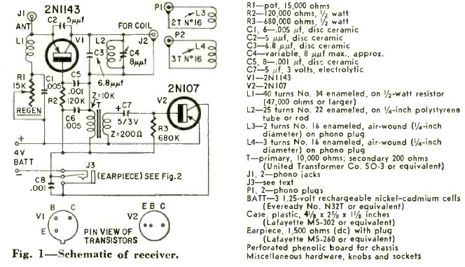 Este receptor VHF de bolsillo fue encontrado en la revista Radio Electronics de enero de 1961. Utiliza un transistor y sintoniza la banda de 11 metros, considerada VHF en aquella época.