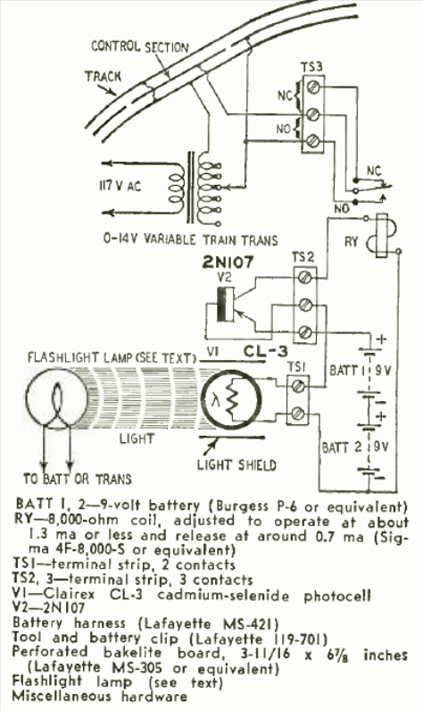 Este circuito detecta problemas de tráfico en un ferrocarril en miniatura, activando una alarma. El circuito fue publicado en la edición de diciembre de 1957 de Radio Electronics.