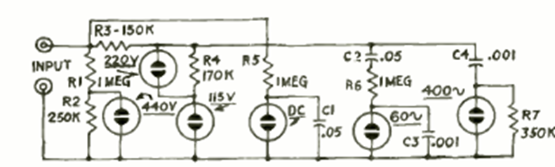 Este circuito fue obtenido de Radio Electronics en mayo de 1967. El circuito consta de un sistema que selecciona la tensión que encenderá la lámpara de neón correspondiente. El circuito funciona hasta 440 V.