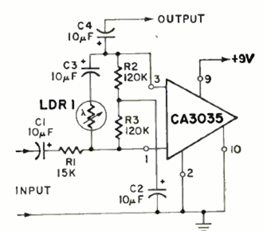 La ganancia de este amplificador está controlada por la luz que incide sobre un LDR. El circuito es de Radio Electronics de febrero de 1970. El CA3035 es un amplificador operacional RCA.