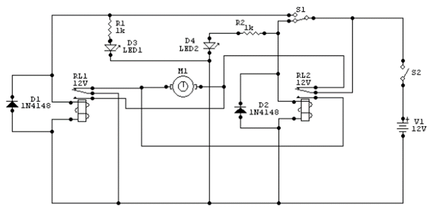 El proyecto anterior es un circuito de accionamiento de puente H –H y se puede utilizar para controlar motores de CC y en el proyecto anterior hemos utilizado el puente para controlar el motor M1. Fue enviado por el lector y colaborador Adriano Muniz Moura. La base del circuito son los relés de 12V y la alimentación es de 12V y se activan por pasos, sirviendo de base para proyectos de robótica y los LED 1 y 2 sirven para indicar el relé que se está activando. El interruptor S2 alimenta todo el circuito electrónico y el interruptor S1 selecciona en qué dirección girará el motor.