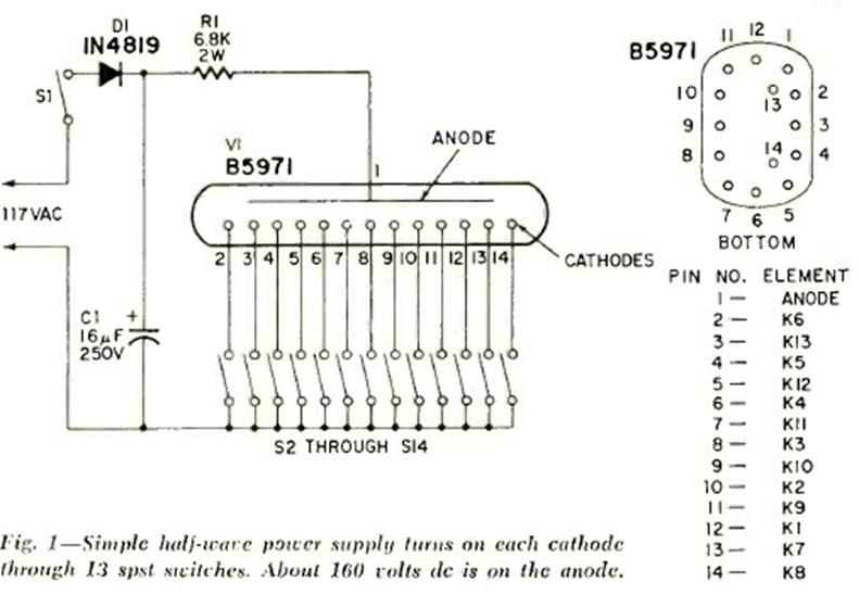 Este circuito experimental con una válvula Nixie se encontró en la revista Radio Electronics de marzo de 1969. El circuito se utiliza para demostraciones y también para probar estas válvulas indicadoras digitales.