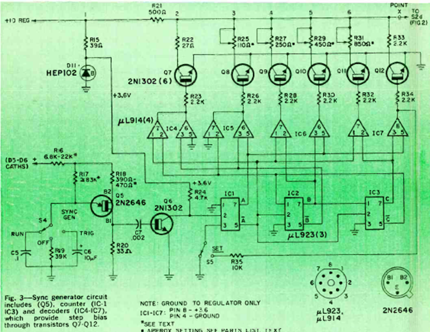 Este trazador de curvas de transistor se describió en un artículo de Radio Electronics de diciembre de 1969. Consiste en un generador de señales en forma de escalera que aplica voltajes escalonados al transistor bajo prueba.