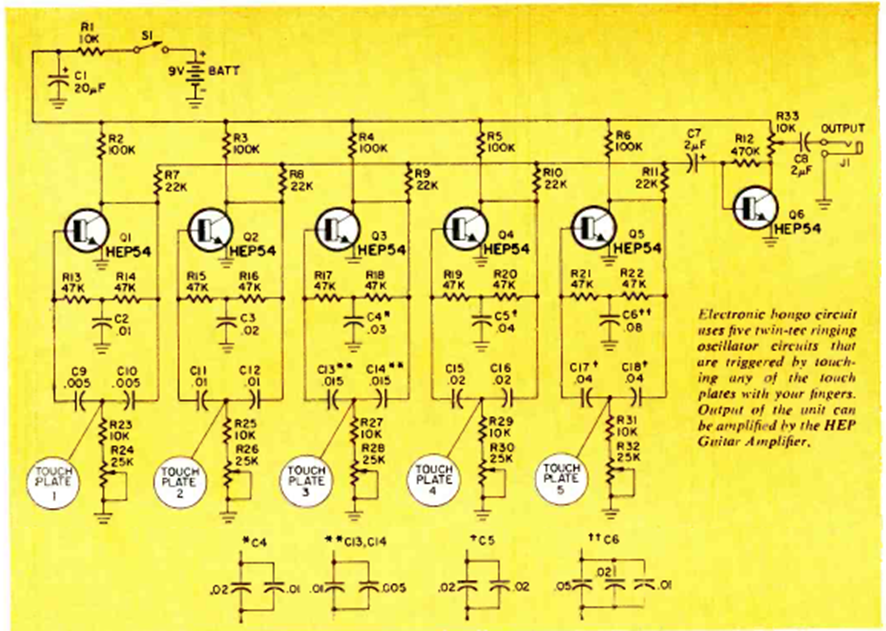 El artículo que enseña cómo montarlo es de Radio Electronics de julio de 1969. El circuito se puede implementar fácilmente con transistores modernos como el BC548. La salida debe estar conectada a un amplificador.