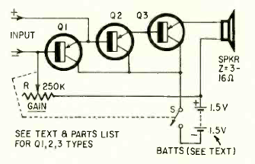 Este es un circuito de alta ganancia con 3 transistores conectados en acoplamiento directo. El circuito es de una Radio Electrónica de febrero de 1966. Los transistores eran tipos de propósito general en la época.
