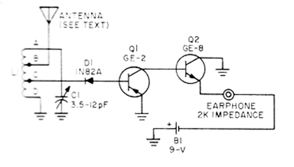 Este circuito es de Elementary Electronics de 1977. Se puede ensamblar con bastante facilidad reemplazando Q2 por un BF494. Q1 puede ser reemplazado por cualquiera de BC548; El teléfono debe ser un teléfono magnético o piezoeléctrico de alta impedancia en paralelo con una resistencia. L1 consta de 2 o 3 vueltas de alambre de 26 de diámetro de 1 cm sin núcleo con grifos en las vueltas. El circuito no es muy sensible, sólo capta las estaciones cercanas más potentes. La antena es telescópica.