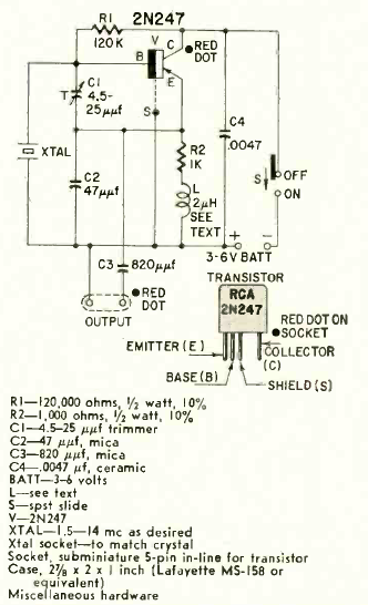 Este circuito de diversos usos en banco fue encontrado en la revista Radio Electronics de enero de 1960. El transistor es un tipo de RF en la época. La alimentación es a través de batería.