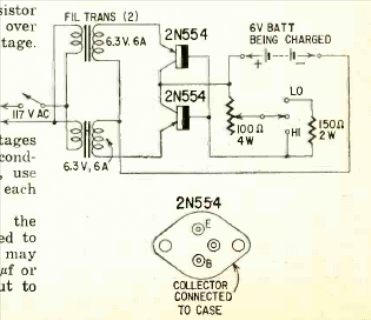 Este circuito funciona tanto como fuente de alimentación como cargador de batería. El circuito utiliza transistores de potencia de la época y fue publicado en la revista Radio Electronics de marzo de 1958.