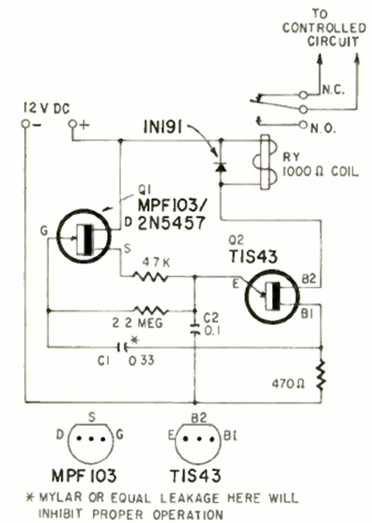 Este circuito fue encontrado en la revista Radio Electronics de junio de 1969. El circuito utiliza un relé activado por un circuito con FET y transistor Unijuntura. El tiempo depende del capacitor.