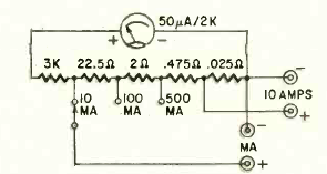 En la figura tenemos el circuito de un amperímetro multirango utilizando un instrumento de escala completa de 50 uA. El circuito es de la revista Radio Electronics de enero de 1960.