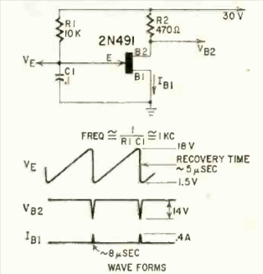 Este es un circuito antiguo con un transistor unijuntura de esa época. Lo encontramos en una Radio Electrónica del año 1959 aproximadamente. El circuito tiene una frecuencia determinada por C1 y R1.