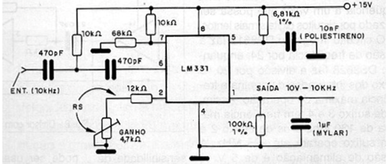 Este conversor se puede utilizar para enviar información de forma remota desde transductores lineales, convirtiendo tensiones en frecuencias. El circuito opera linealmente, convirtiendo tensiones de 0 a 10 V a frecuencias de 0 a 10 kHz. El resistor y el capacitor conectados al pin 5 del circuito determinan el rango de frecuencia de funcionamiento. El circuito integrado LM331 utilizado en este proyecto es fabricado por National Semiconductor.