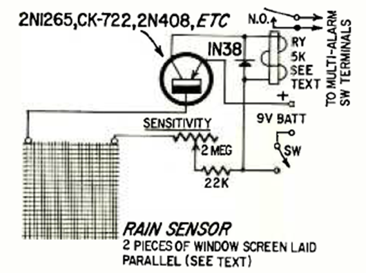 Este sencillo circuito que activa un relé fue encontrado en la revista Radio Electronics de mayo de 1966. El sensor está formado por dos pantallas con un paño entre ellas con una pequeña cantidad de sal.