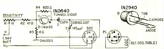 Este circuito fue encontrado en la revista Radio Electronics de abril de 1961. El dispositivo tiene una ranura para bobinas que determinan su rango de operación. La alimentación proviene de una sola batería.