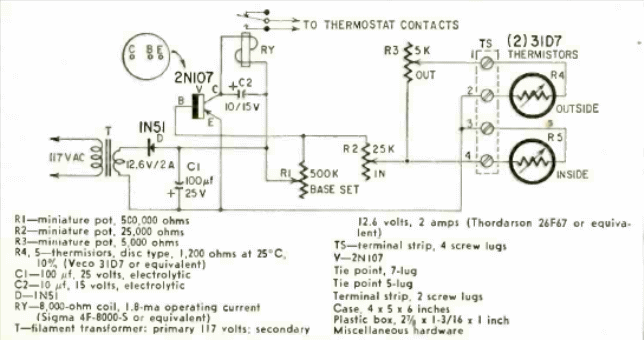 Este circuito de control térmico apareció en la revista Radio Electronics de octubre de 1958. El circuito se alimenta de la red eléctrica y dispone de dos sensores que funcionan de forma diferencial.