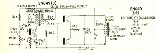 Este circuito proviene de una documentación de Radio Electronics de julio de 1959. En esta documentación se anunció el nuevo transistor. La potencia del circuito fue de 100 mW con alimentación de 18 V.
