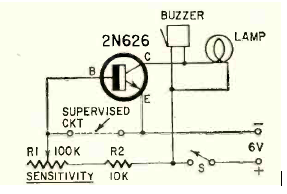 El sensor de esta alarma es un cable delgado que, cuando se interrumpe, activa un timbre y enciende una lámpara. El transistor es un Darlington 2N626. El circuito es de una Radio Electronics de junio de 1961.